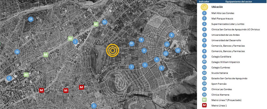 Terreno con aptitud para desarrollo inmobiliario residencial con buenos accesos por calle Camino Las Flores en el sector de Los Dominicos Antiguo. Sector consolidado exclusivo de viviendas cercano a clínicas, colegios y universidades.